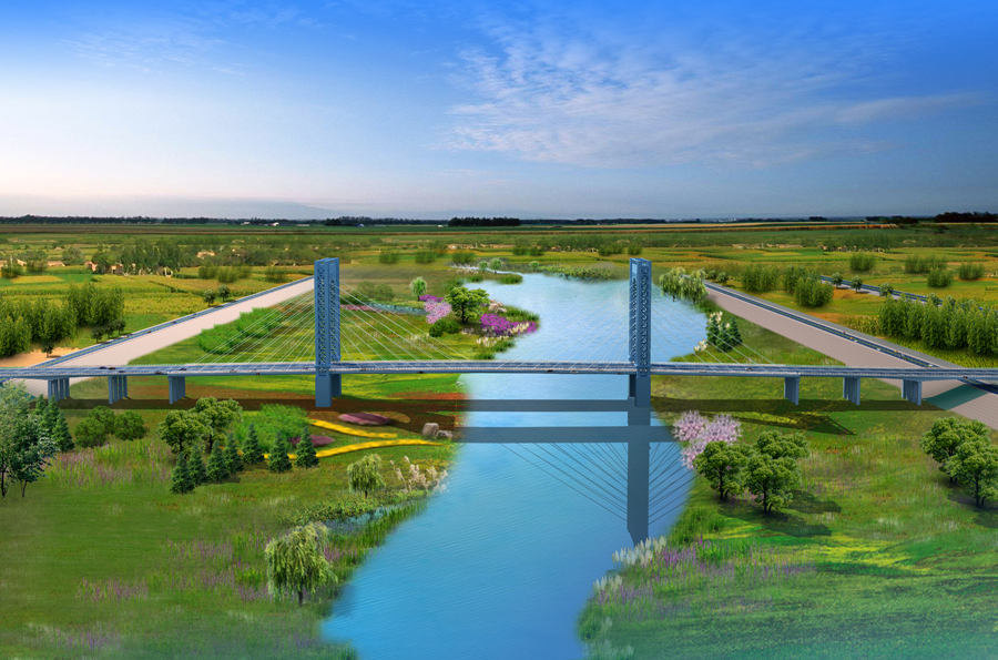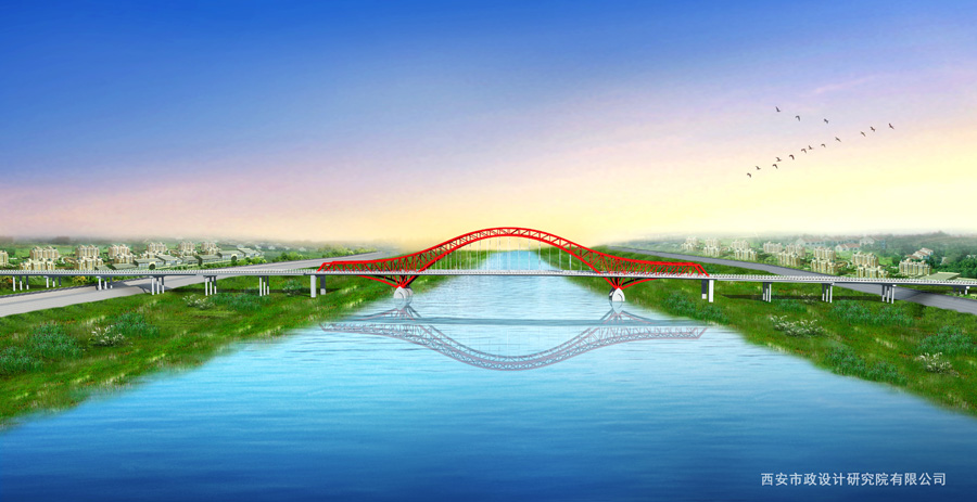 植物園渭河特大橋是寶雞市跨越渭河的一條重要通道,對于完善寶雞市路網,增強寶雞市渭河南北的連通、加強各片區間的交通聯系、促進城市經濟的發展等具有重要意義。橋梁總長988.4m,橋梁寬度23-30m,主橋為65+158+65m三跨連續鋼桁拱橋。兩側邊跨為平弦桁梁,中跨為剛性拱柔性梁的鋼桁拱橋,橋梁跨徑布置合理,結構比例協調,與橋位處環境結合較好,似一輪剛剛升起的紅日,帶給大地勃勃生機。