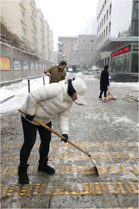 昨天開始,西安再降大雪,積雪覆蓋了公司辦公大院,為員工出行帶來了諸多不便。今天一大早,四方公司經(jīng)理沐建國同志立即組織和帶領(lǐng)部門同志對院內(nèi)積雪進行清掃,同時駕駛員趙建剛、郝穩(wěn)忠、季旺軍等同志也自覺加入其中。不一會兒,地下空間所郭茜彥、唐哲、甄俊田也紛紛拿起鐵鍬和掃帚,自愿加入到積雪清掃中。他們手被凍得通紅,褲子都被打濕了,也絲毫不在意。經(jīng)過大家的共同努力,保證了大家的安全出行。