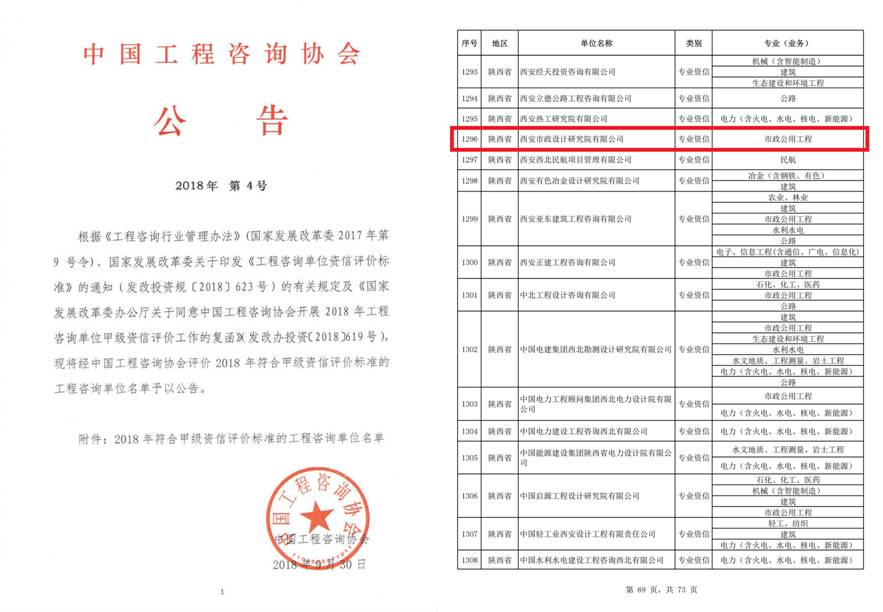 根據(jù)工程咨詢行業(yè)改革發(fā)展需要,國家發(fā)改委于2017年11月6日發(fā)布《工程咨詢行業(yè)管理辦法》取消對工程咨詢單位資格證書認定,授權(quán)中國工程咨詢協(xié)會對工程咨詢單位開展行業(yè)資信評價,新資信評價工作于2018年展開。我公司在原有國家發(fā)改委頒發(fā)的“工程咨詢單位甲級資質(zhì)(市政交通、給排水)”基礎(chǔ)上,依據(jù)自身實力及良好的業(yè)績,積極開展相關(guān)申報工作,于9月30日順利通過全國首批工程咨詢市政公用工程專業(yè)甲級資信,可承攬市政公用工程專業(yè)規(guī)劃咨詢、項目咨詢、評估咨詢、全過程咨詢等業(yè)務(wù)。