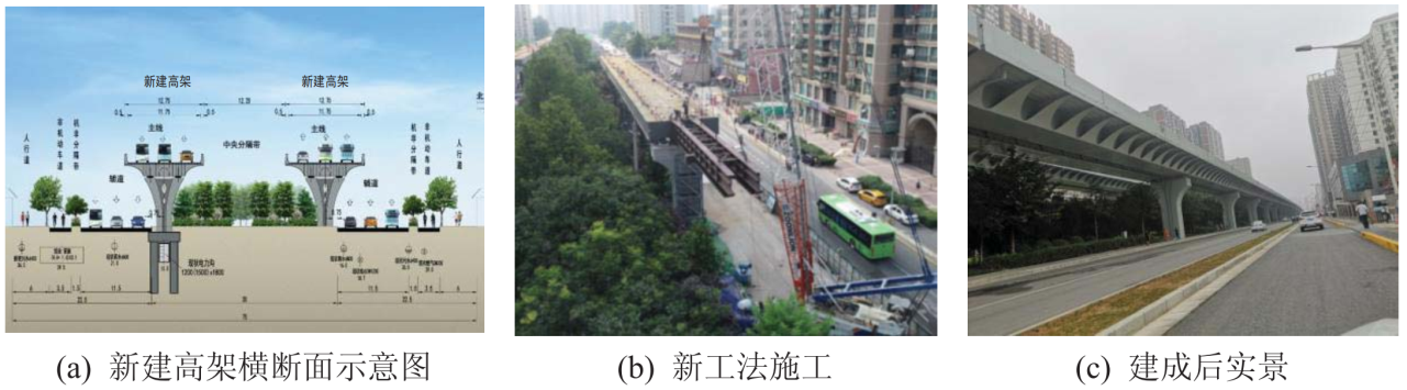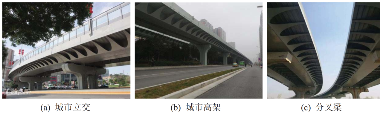 (1)上部結(jié)構(gòu)創(chuàng)新及關(guān)鍵技術(shù):發(fā)明了一種功能分區(qū)設(shè)計的部分敞口鋼梁,創(chuàng)新了城市鋼橋上部結(jié)構(gòu)的主梁結(jié)構(gòu)形式。提出的功能分區(qū)設(shè)計的部分敞口鋼梁,較常規(guī)鋼板(組合)梁或鋼箱(組合)梁造型更加美觀;鋼主梁結(jié)構(gòu)體系主、次清晰,受力合理,其每平米用鋼量較常規(guī)鋼箱梁橋可節(jié)約15%~20%;主要受力構(gòu)件和次要受力構(gòu)件可視橋下實際情況同期或者分期施工,新工法對城市復(fù)雜交通環(huán)境的適應(yīng)性更高,施工效率可以提高2~3倍。由于新型鋼梁自重輕、整體性強,施工工法適應(yīng)性強,非常適用于城市各類鋼橋,尤其是高架橋和立交橋梁中的變寬梁和分叉梁。