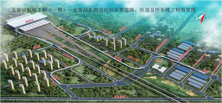北客站樞紐工程(一期)——北客站東側進出站高架道路、匝道及停車樓工程位于西安市經濟技術開發區高鐵新城,緊鄰西安北客站,設計范圍為元鳳二路以南,高鐵站以東,元朔路以北,延西高速以西,設計內容包含約6.5km高架(結構形式為樁基、承臺、墩柱、現澆箱梁及鋼箱梁,主線寬度12.5m)、市政道路約2km、管網設計、綠化提升,工程費用為11.74億元。