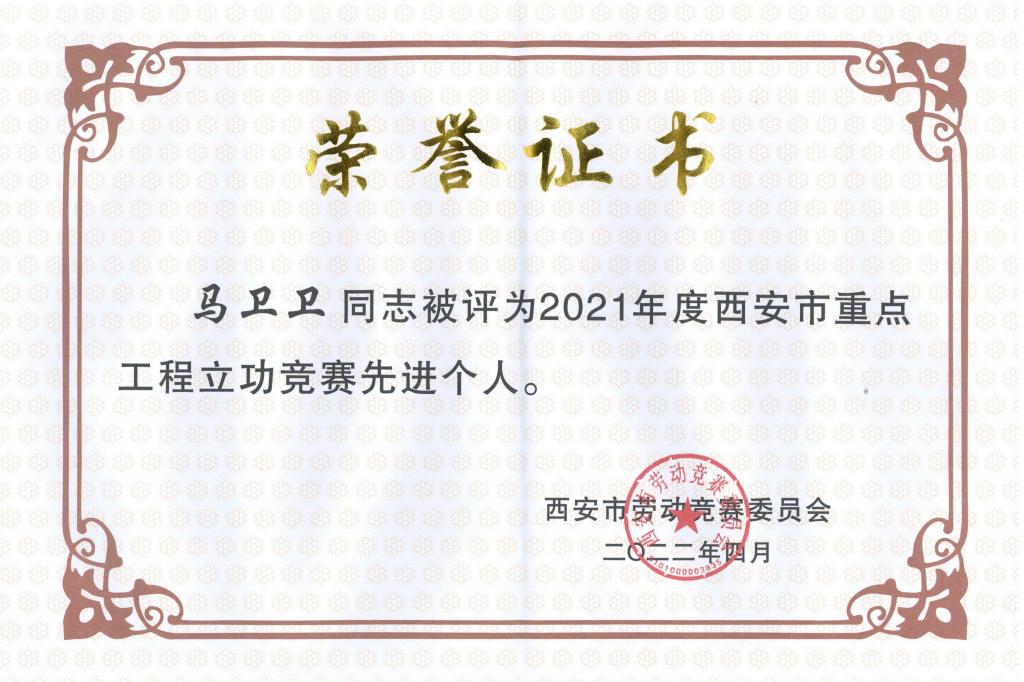 馬衛(wèi)衛(wèi)榮獲“2021年西安市重點(diǎn)工程立功競賽先進(jìn)個人”及西安市建設(shè)交通工會“十佳工匠”榮譽(yù)稱號;