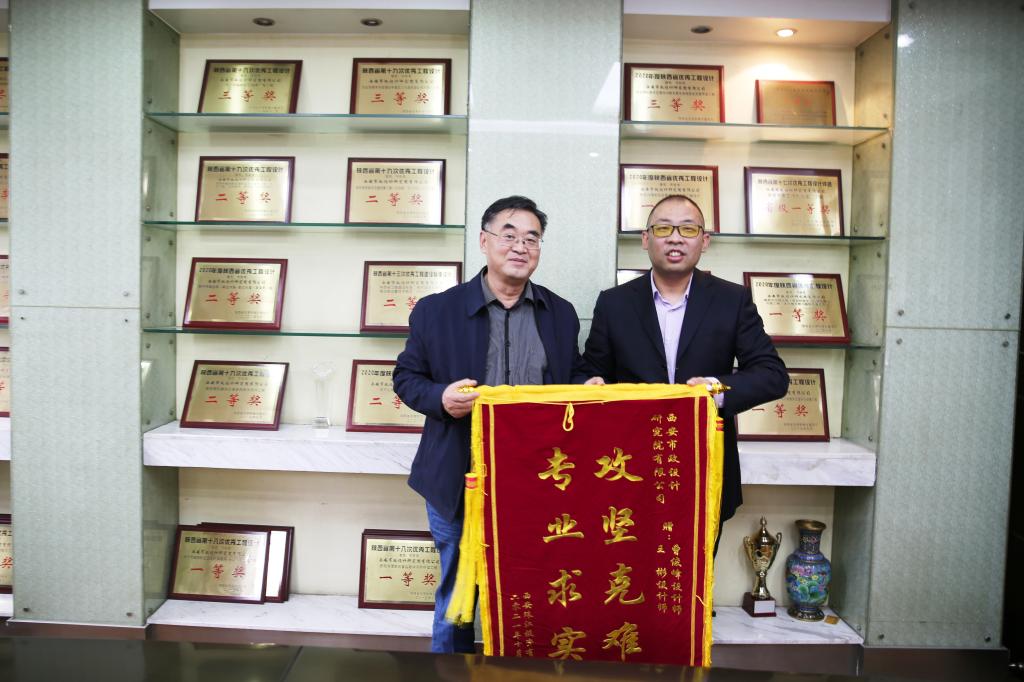5月18日下午,西安珠江投資有限公司設計部副部長富博蒞臨我公司,將一面寫有“攻堅克難 專業求實”的錦旗送到我公司副總經理王社平的手中,以感謝“西安珠江新城項目三期規劃路過街管溝工程”項目設計組成員的精心設計、優質服務和辛苦付出,并表達了雙方開展更深層次合作的期望。