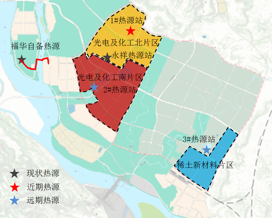 本次供熱規(guī)劃區(qū)別于傳統(tǒng)供熱規(guī)劃,由于基地承接原有園區(qū)企業(yè)退岸入園,熱源選擇受上位規(guī)劃確定的區(qū)域內(nèi)排污總量控制指標、鍋爐總蒸發(fā)量的限制。我公司項目組成員根據(jù)現(xiàn)狀實際情況,分別對當?shù)卮嬖诘碾y以回收生物質(zhì)資源、清潔天然氣資源、大型化工廠自備熱源富裕容量和余熱等進行了資源量和經(jīng)濟性分析,確定采用現(xiàn)狀大型企業(yè)自備熱源廠和清潔天然氣鍋爐房作為熱源的優(yōu)選方案。結(jié)合基地熱負荷分布密度、子園區(qū)產(chǎn)業(yè)特性,減小施工難度和工程造價,共規(guī)劃三座熱源站。熱源總裝機765t/h,各熱源站通過熱網(wǎng)聯(lián)通,實現(xiàn)互聯(lián)互通。