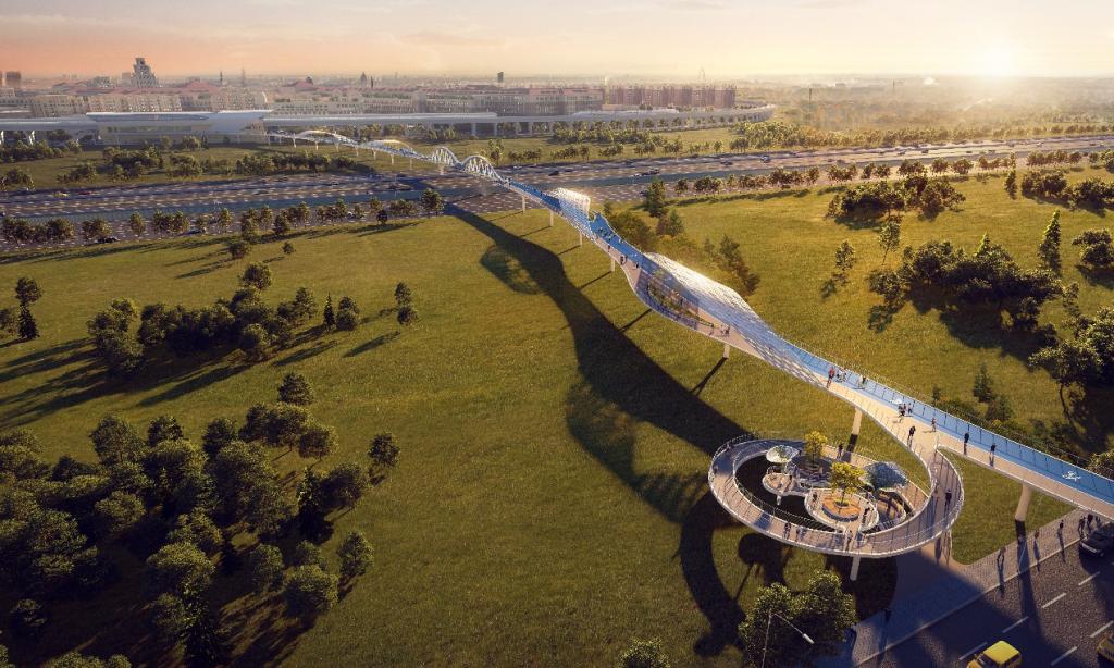 該人行天橋是聯通創新港一期(交大創新港)與二期B版塊學生公寓的重要通道,也是B版塊中央創新軸的重要延伸,該橋的建設能有效加強高校人才與企業之間的交流,達到推進B版塊人才交流建設的目的。