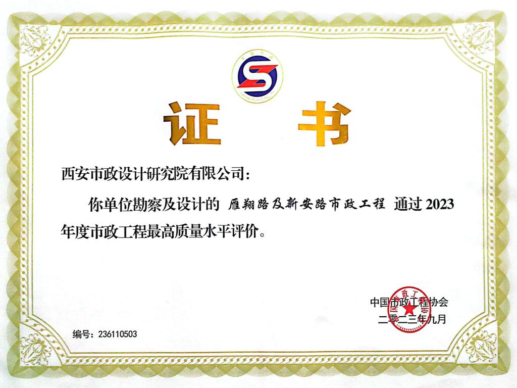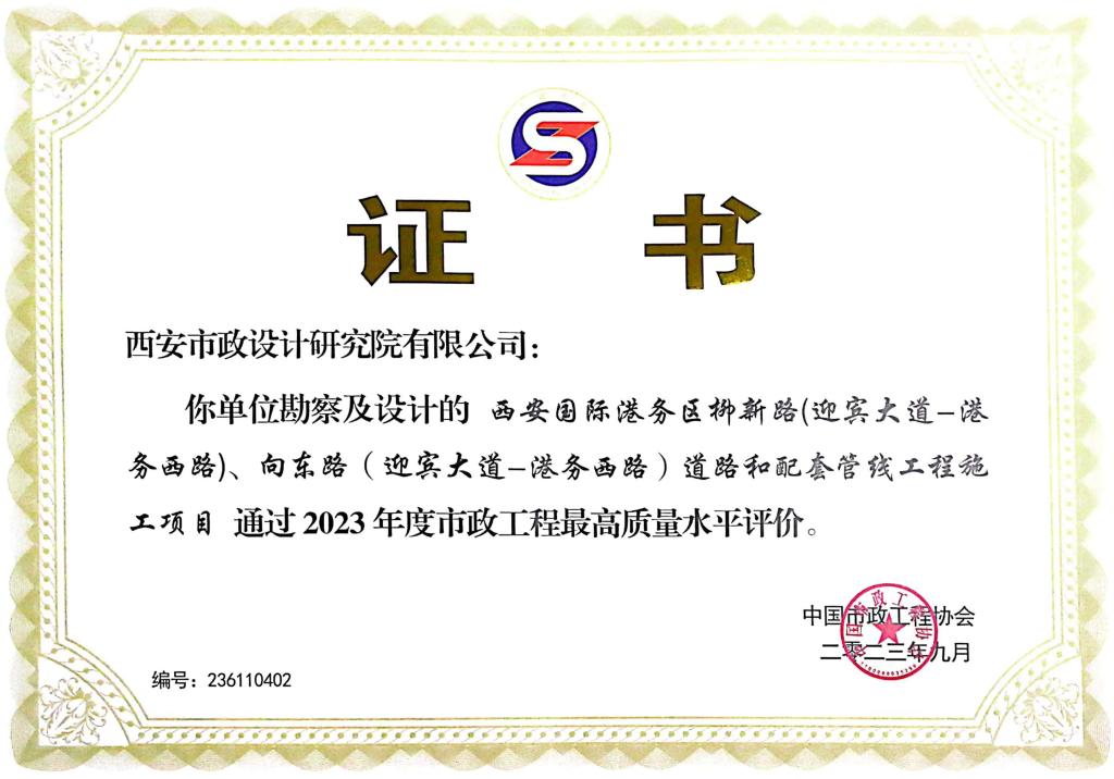 近日,中國市政工程協會頒發了2023年度市政工程最高質量水平評價榮譽證書,我公司勘察設計的“西安國際港務區柳新路(迎賓大道-港務西路)、向東路(迎賓大道-港務西路)道路和配套管線工程”、“雁翔路及新安路市政工程”獲此殊榮。