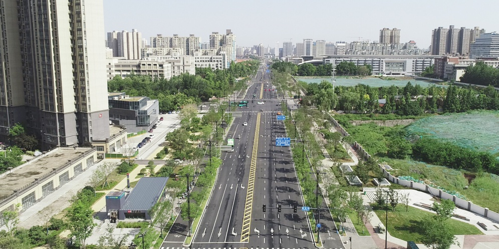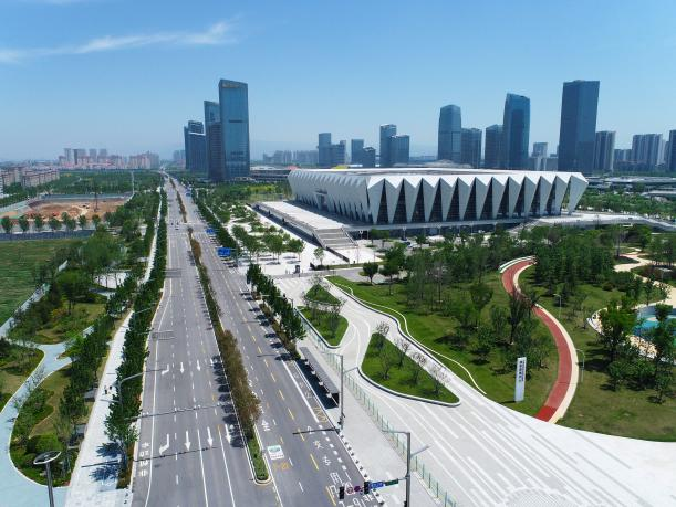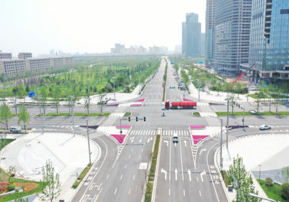 西安國際港務區柳新路(迎賓大道-港務西路)、向東路(迎賓大道-港務西路)道路和配套管線工程,為西安國際港務區“六橫五縱”主干骨架路網中重要的“兩橫”,是奧體中心重要對外交通通道。其中柳新路位于西安奧體中心主場館北側,道路全長2107.882m,規劃紅線寬度50m,雙向6車道;向東路位于西安奧體中心主場館南側,道路全長1968.553m,規劃紅線寬度70m,雙向8車道。主要包括道路、排水、再生水、交通、管溝等專業。道路設計遵循通行舒適、景觀協調、公交優先、以人為本的設計理念,合理分配機動車、公交車、非機動車、行人路權。在交叉口設計中,通過設置導流島,使得有限的空間資源最大程度發揮交通設施的效率;在人行道鋪裝設計中,通過石材樣式的變化,使得整體鋪裝與周邊景觀綠化、場館相互融合;在慢行空間打造上,重新統籌空間,設置自行車專用道;結合公交、地鐵站點合理布設自行車??奎c,引導居民采用“自行車+公交”的出行方式;在附屬設施設計中,通過港務區特有的路緣石、路名牌、車止石等小構件設計,提升道路整體觀感和使用品質。