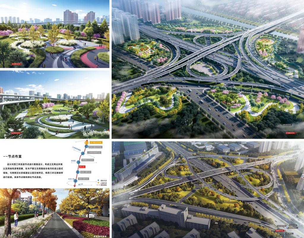 “碧環(huán)聚山水,玉帶繞長(zhǎng)安”——西安三環(huán)擴(kuò)能提升城市環(huán)廊景觀更新, 方案依托西安城市三環(huán)繞城環(huán)線,連接城市內(nèi)部綠色網(wǎng)絡(luò),貫穿城市外圍綠道功能,銜接三環(huán)城市公園,滿足市民景觀功能需要,串珠成鏈,匯聚成韌性城市骨架生態(tài)綠環(huán),完善城市功能,提升區(qū)域價(jià)值,打造西安歷史人文生態(tài)景觀帶。